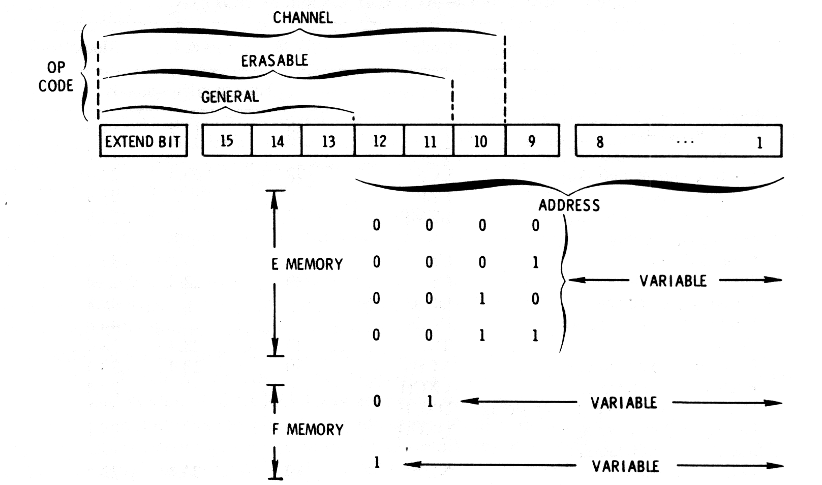 Eine weitere Technik, die eingesetzt wurde, um den Befehlssatz zu erweitern, war es, einen zusätzlichen Satz an Opcodes bereitzustellen, der über eine spezielle Anweisung, EXTEND, angesprochen wurde. Vor einer dieser erweiterten Anweisungen musste also jeweils die EXTEND-Anweisung aufgerufen werden, was zusätzlichen Overhead bedeutete. Damit der Overhead nicht zu groß wurde, verteilten die Entwickler die einzelnen Instruktionen aufgrund deren Verwendungshäufigkeit zwischen den „normalen” und den „erweiterten” Anweisungen. Die obige Abbildung (aus „Journey to the Moon”) zeigt den Aufbau eines Befehlswortes im AGC (Block II) zur Nutzung solcher erweiterten Befehlssätze.